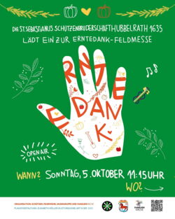 Am Sonntag, 05.10. findet um 11:15 Uhr die traditionelle Feldmesse auf dem Gut Groß Berghaus in Hubbelrath statt. Diese Messe wird von den Hubbelrather Schützen gemeinsam mit der Kirchengemeinde als Erntedank-Freiluftmesse gefeiert und weist dadurch einen besonders schönen Charakter auf. Direkt in der schönen Hubbelrather Natur sind wir der Schöpfung sehr nah und danken Gott für die reichen Gaben der Felder. Die Adresse lautet: Dorper Weg 22 in 40629 Düsseldorf-Hubbelrath (Reiterhof der Familie Hucklenbroich). Der Dorper Weg befindet sich ganz im Osten, am Rande des Stadtgebietes, fast schon in Mettmann. Untermalt wird die Messe von einer Blasmusikgruppe. Nach der Messe sorgen fleißige Hände der Hubbelrather Feuerwehr (die gerade ihr 100-jähriges Jubiläum feiert) sowie der Cäcilia-Kompanie Schützen für Speis und Trank. Bei schlechtem Wetter findet die Messe in der Reithalle statt.
