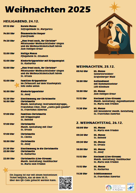In unserer Pastoralen Einheit "Düsseldorfer Osten" bieten wir im Advent Stille, Gottesdienste für ganz unterschiedliche Zielgruppen und in vielfältigen Formaten, professionellen Musikgenuss ebenso wie alte Adventslieder, gute Worte aus der Heiligen Schrift, Gemeinschaft und Segen. Eine sich wöchentlich erweiternde Übersicht können Sie hier aufrufen. Auf einer gesonderten Seite haben wir Angebote speziell für Familien gesammelt, zu der Sie hier gelangen. Ebenso finden Sie eine komplette Übersicht über alle unsere Gottesdienste immer aktuell hier auf dieser Seite.