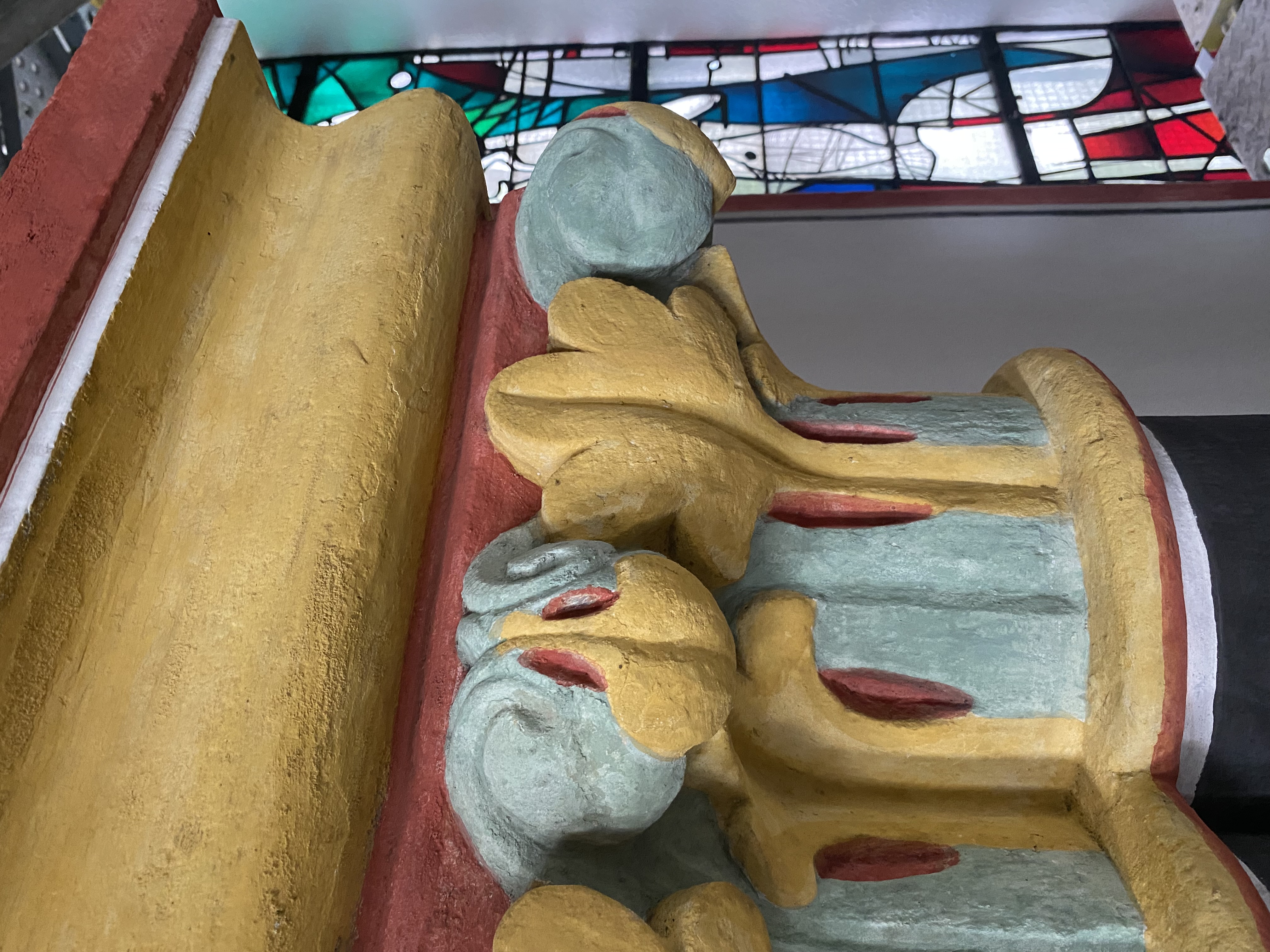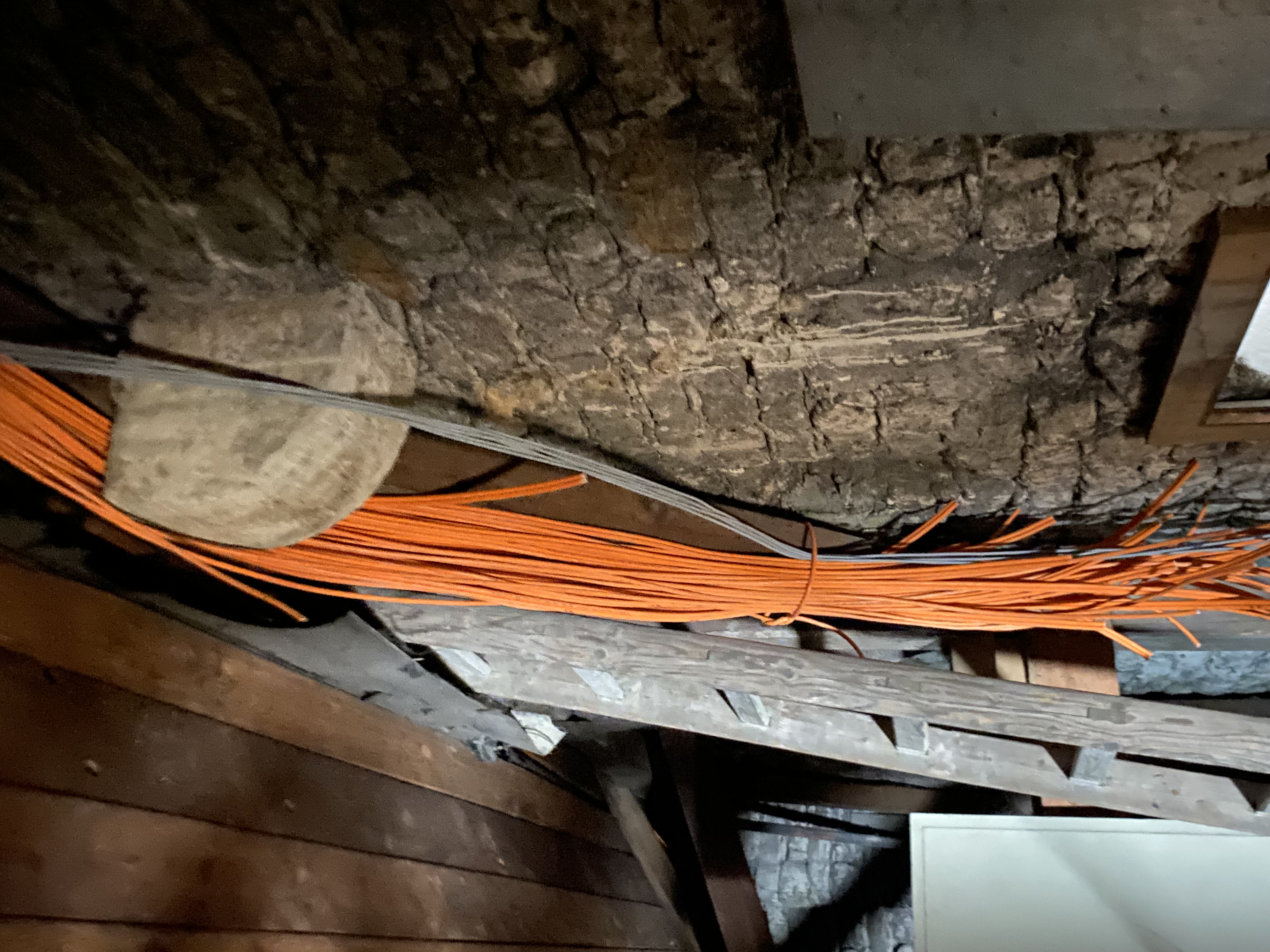Sommerzeit ist keine Sommerpause - zumindest nicht für die Sanierungsarbeiten im Innenraum der Basilika St. Margareta, denn die Arbeiten gehen zügig und planmäßig voran. Die Ausbesserungs-, Reinigungs- und Malarbeiten an den Wand- und Gewölbeflächen sowie an den schmückenden Steinelementen sind weit fortgeschritten. An vielen Stellen im immer noch komplett eingerüsteten Innenraum sind Pinsel, Farbeimer, Strahler und Farbpulver allgegenwärtig. Je höher man kommt, desto deutlicher erkennt man die bereits fertigen Flächen und Verzierungen, wie dieses Kapitell vor den großen Westfenstern über dem Haupteingang. In der unteren Reihe geben die drei Bilder einen Eindruck von den aufwändigen Arbeiten bei der Bohrung und Verlegung von vielen Kilometern (!) neuer Kabel - an und in den Wänden, im Boden, durch Mauern, durch Dachstühle und auf später nicht sichtbaren Kabelschächten. Die beiden letzten Bilder in der unteren Reihe sind im Dachstuhl des nördlichen Seitenschiffs (= Seite Gerricusstraße) entstanden.