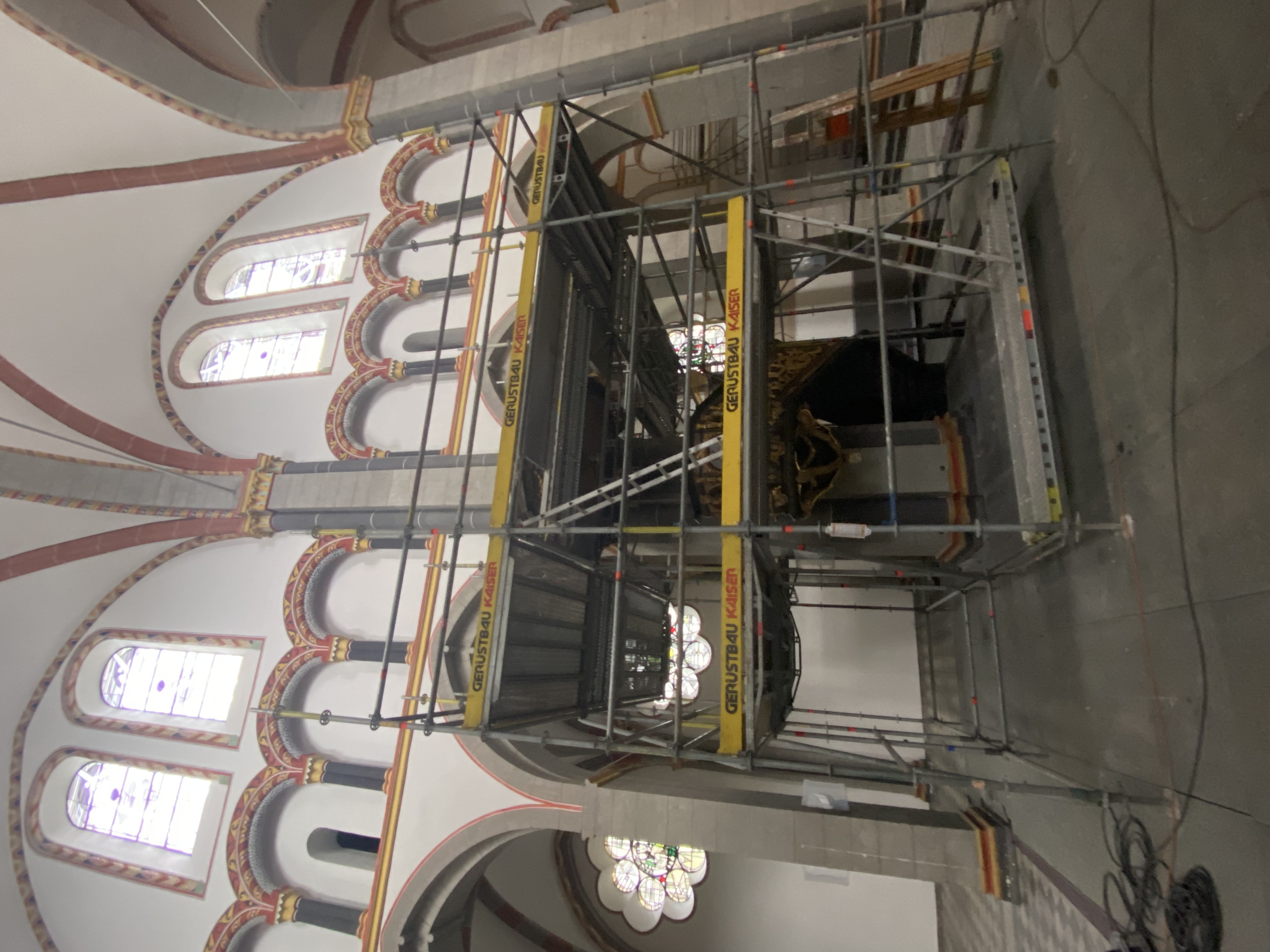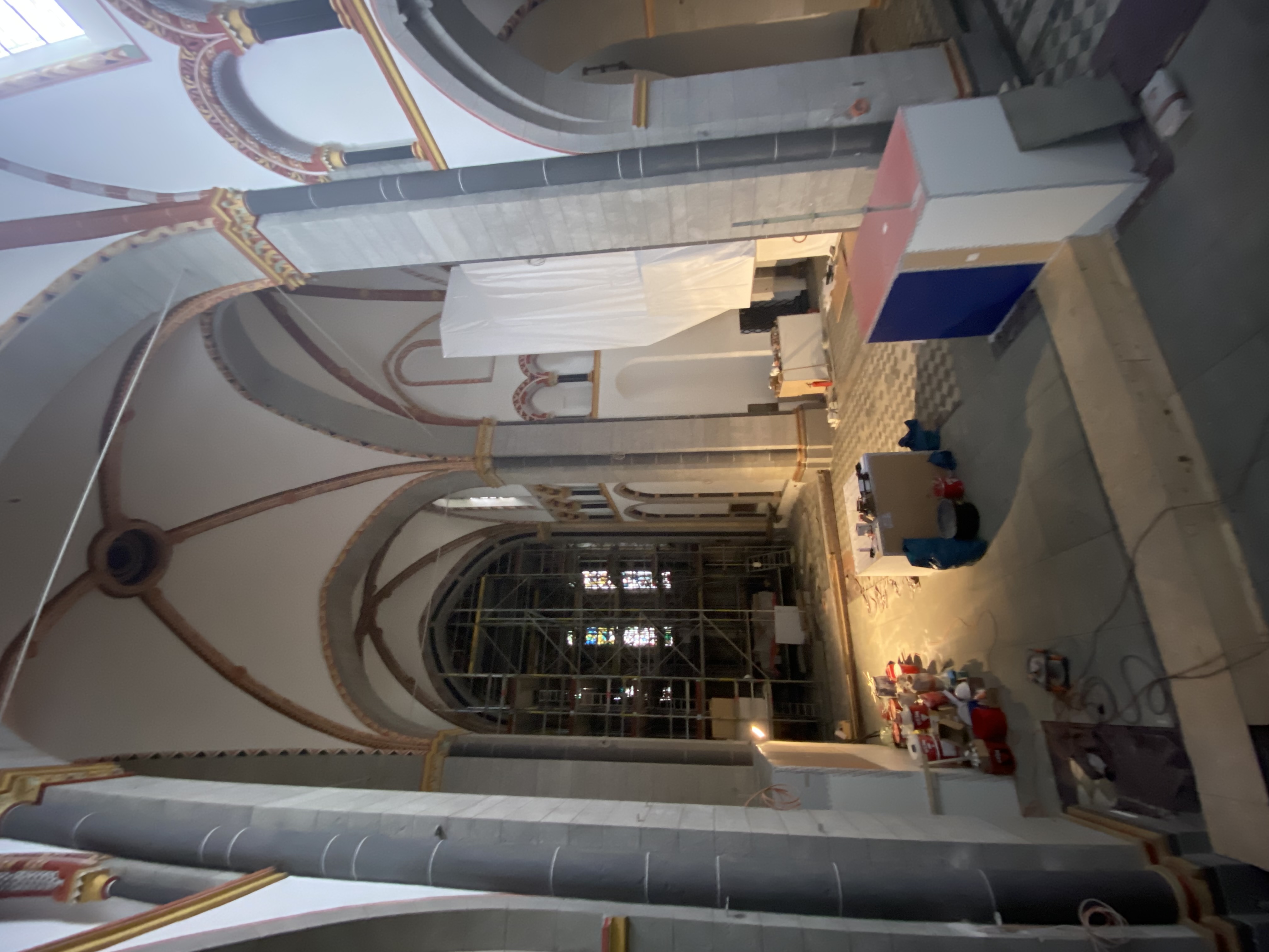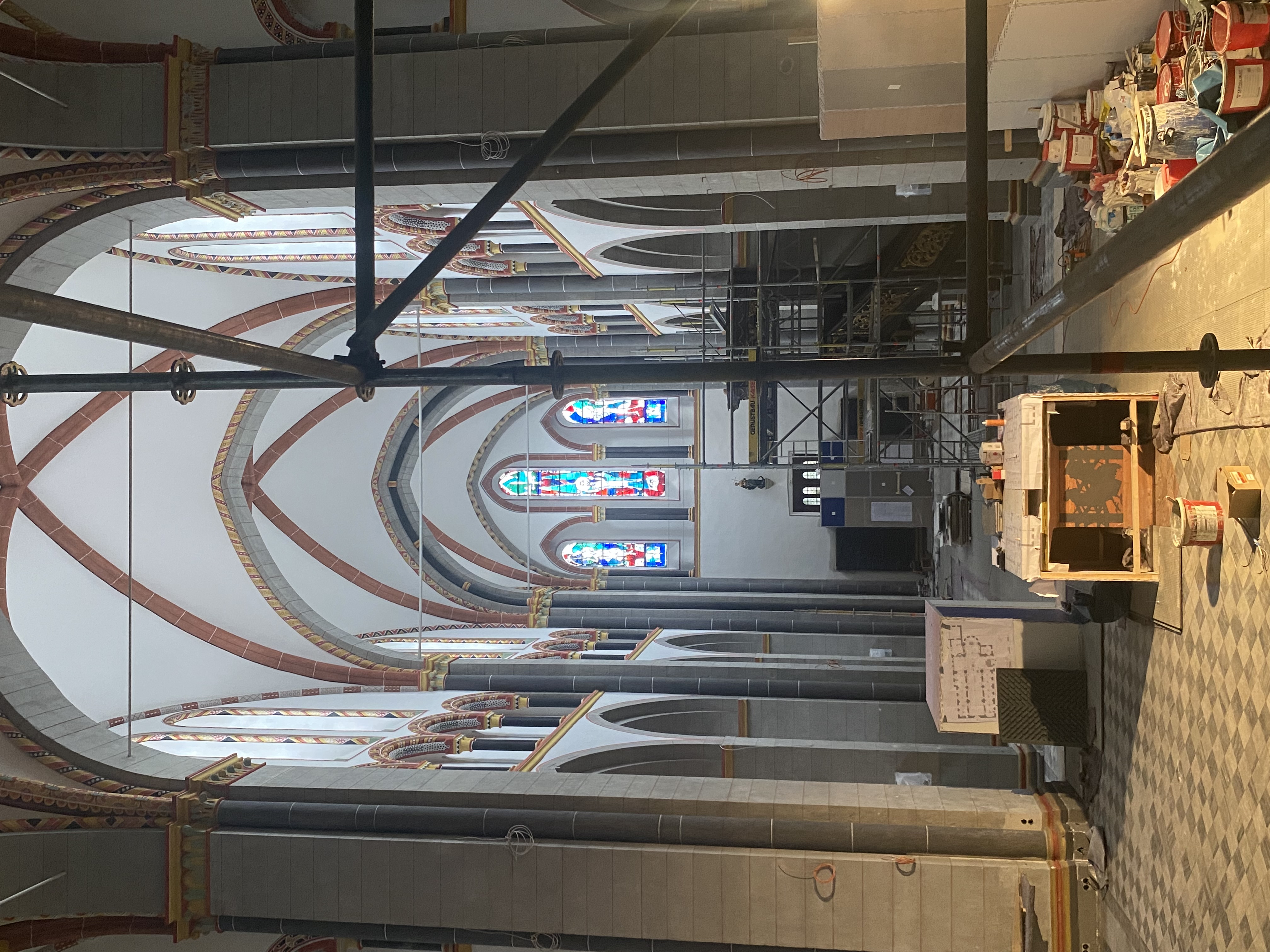 Nachdem fast alle Gerüstteile den Innenraum wieder verlassen haben werden nun auch Stück für Stück die mit dicken Holzplatten gesicherten Ausstattungsstücke der Basilika wieder sichtbar: Altar, die lange gotische Tabernakelsäule sowie die Kanzel, die auch schon wieder die ersten Engelsköpfe sichtbar macht. Auch die große Metallschutzwand vor der Apsis wurde bereits entfernt. Die Kerzenecke verbleibt am gleichen Standort und wird nun für die zukünftige Nutzung mit einem Abluftsystem ausgestattet. An mehreren Stellen im Boden werden derzeit Stellen für Elektroanschlüsse (für Mikros, Strom,...) vorbereitet.