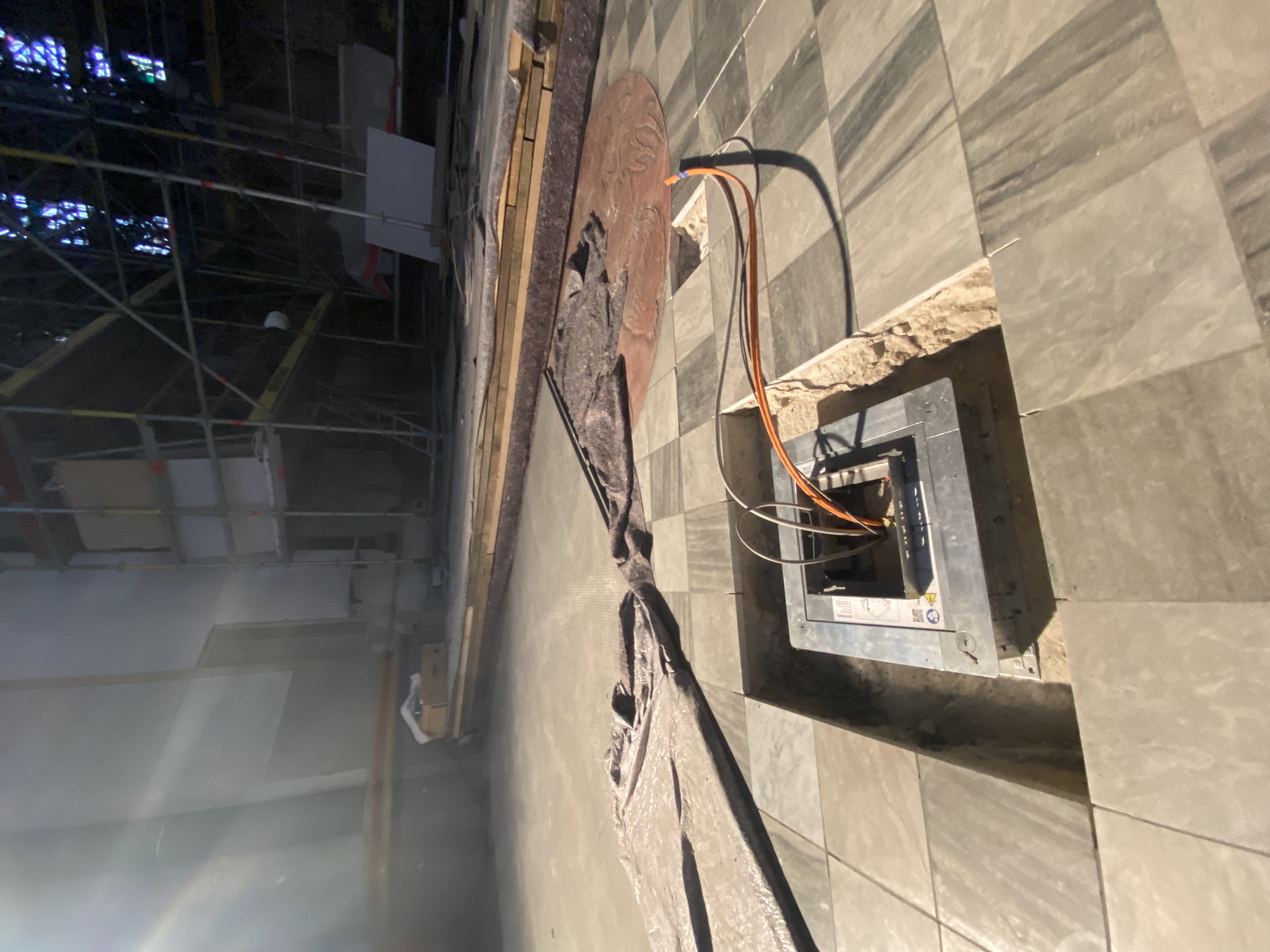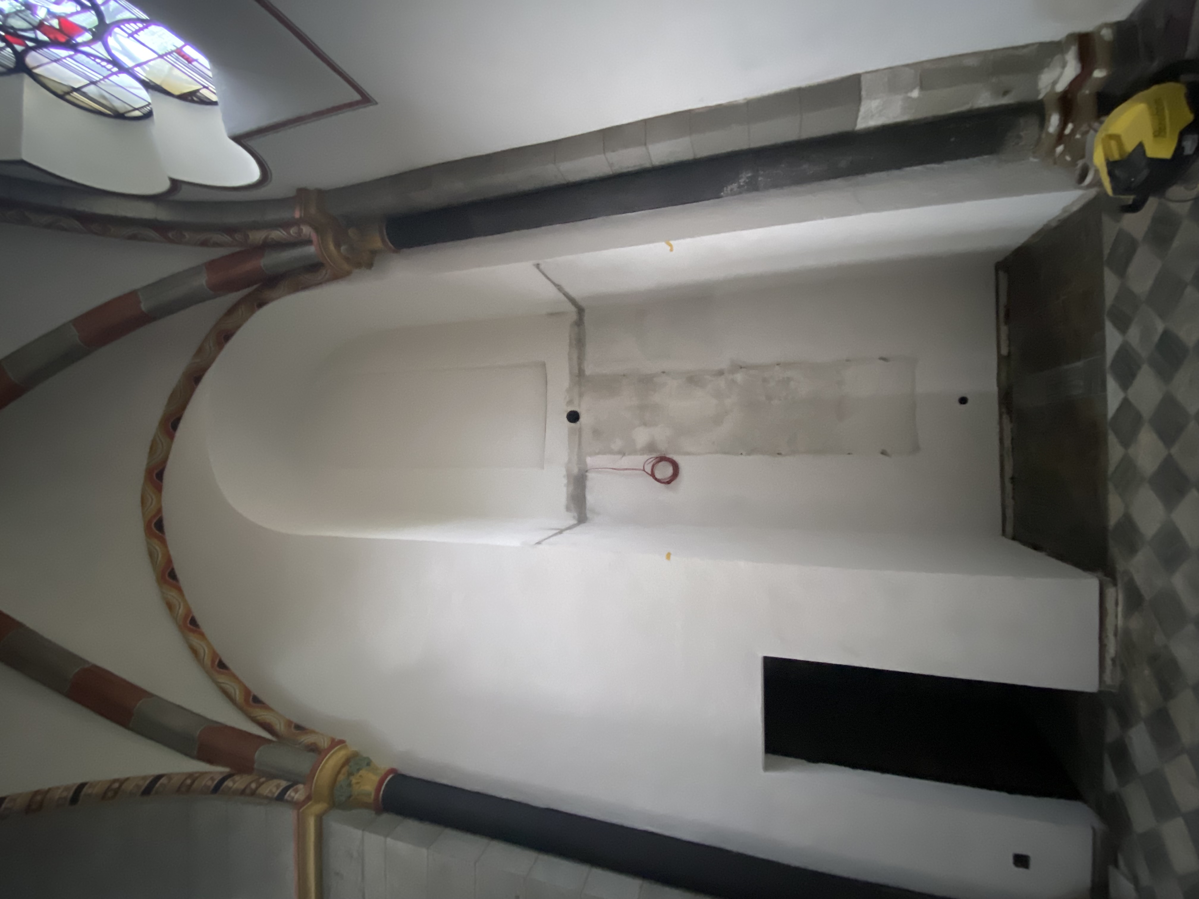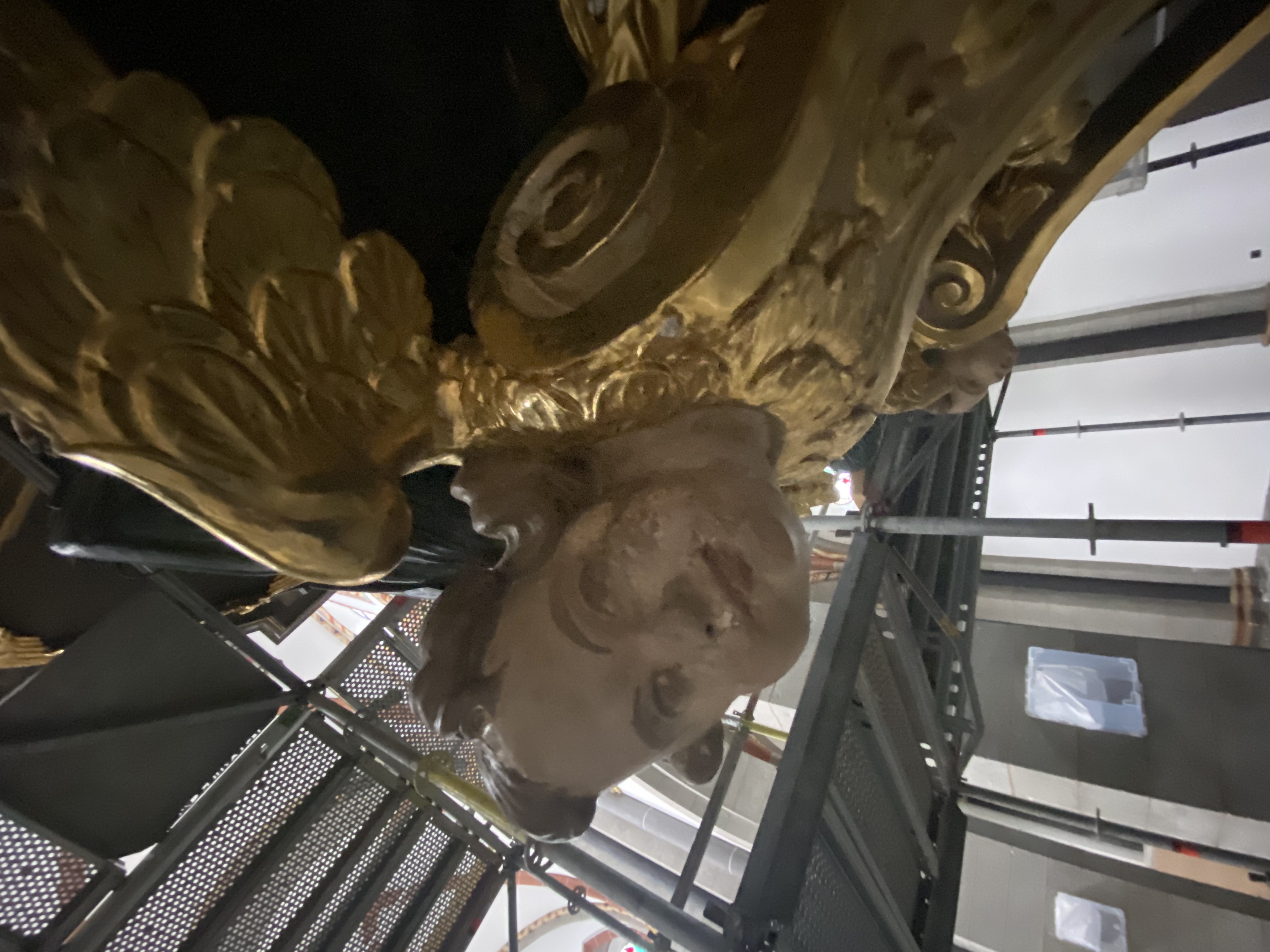 Nachdem fast alle Gerüstteile den Innenraum wieder verlassen haben werden nun auch Stück für Stück die mit dicken Holzplatten gesicherten Ausstattungsstücke der Basilika wieder sichtbar: Altar, die lange gotische Tabernakelsäule sowie die Kanzel, die auch schon wieder die ersten Engelsköpfe sichtbar macht. Auch die große Metallschutzwand vor der Apsis wurde bereits entfernt. Die Kerzenecke verbleibt am gleichen Standort und wird nun für die zukünftige Nutzung mit einem Abluftsystem ausgestattet. An mehreren Stellen im Boden werden derzeit Stellen für Elektroanschlüsse (für Mikros, Strom,...) vorbereitet.