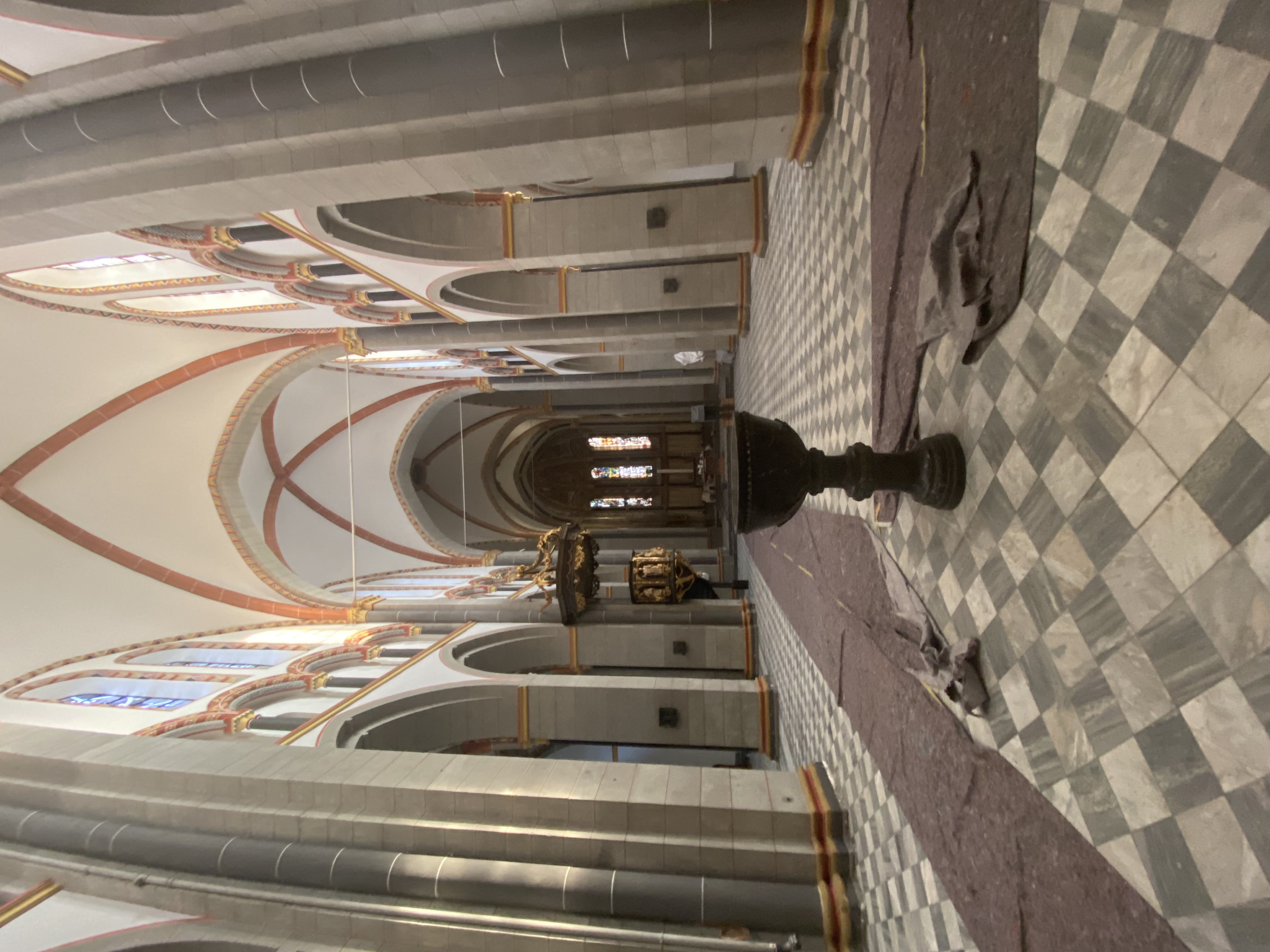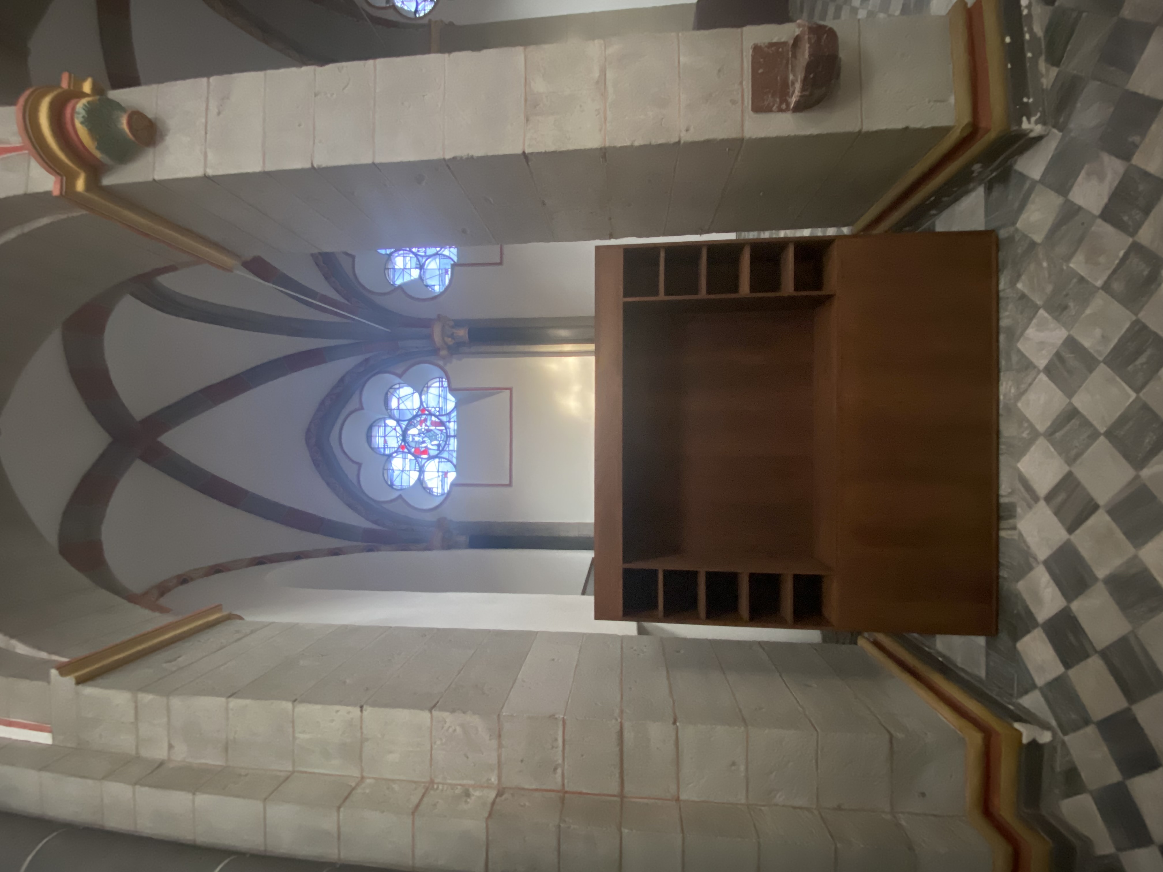 Hinter der Basilika sichtbar wird ein Teil der neuen Luft-Wasser-Wärmepumpe. Sie ergänzt zukünftig die Heizleistung und sorgt für eine energetische Verbesserung. Ein großer Teil des neuen Mobiliars ist bereits geliefert und teilweise eingebaut. Beeindruckend ist der helle und frische Raumeindruck bei natürlicher Sonneneinstrahlung, denn die Installation der zahlreichen neuen Lampen steht erst für die kommenden Wochen auf dem Bauplan. Das Taufbecken hat seinen neuen Platz im Eingangsbereich gefunden.